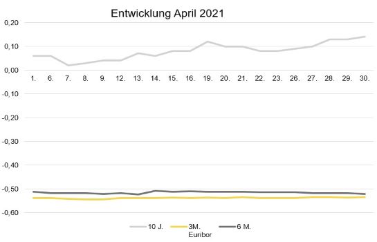 Im April sind die langfristigen Zinsen nochmal moderat gestiegen. So stieg der 10-Jahres-Zinswap von 0,06 Prozent am Monatsanfang auf 0,14 Prozent am Monatsende. Die kurzfristigen Zinsen bleiben weitgehend konstant. Der 3-Monats-Euribor sank nur geringfügig von -0,538 am Monatsanfang auf ‑0,535 Prozent am Monatsende. Auch der 6-Monats-Euribor sank etwas von ‑0,512 auf ‑0,521.